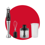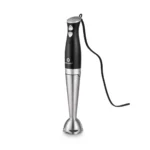 Batidora de mano profesional con potencia de 300W y diseño ergonómico, ideal para preparaciones gourmet. Fabricada en acero inoxidable con cuchillas integradas, incluye 3 accesorios intercambiables (varilla mezcladora, batidor y picador/rebanador). Perfecta para sopas, salsas, purés y picados rápidos en cocinas domésticas o profesionales.