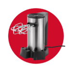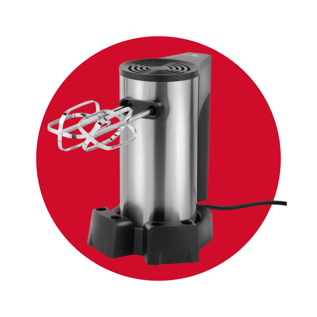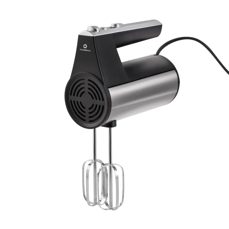 Batidora manual Indurama de 200W en acabado cromo. Ofrece 5 velocidades más función turbo. Incluye base de soporte y juegos de aspas para batir y amasar.