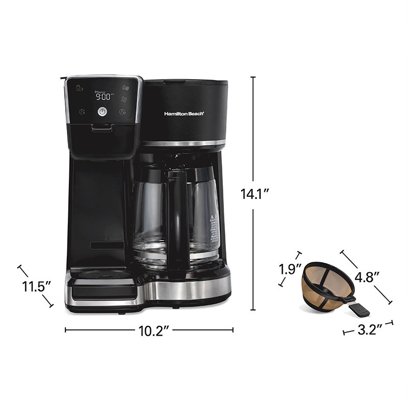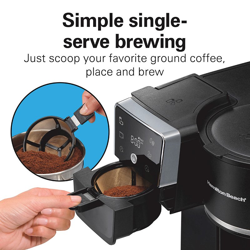 una cafetera completa. Prepara una taza individual de 177-414 ml o una cafetera completa con tu café molido favorito. La cafetera programable Hamilton Beach de dos vías prepara café de ambas maneras. No es compatible con cápsulas K-Cup®*.