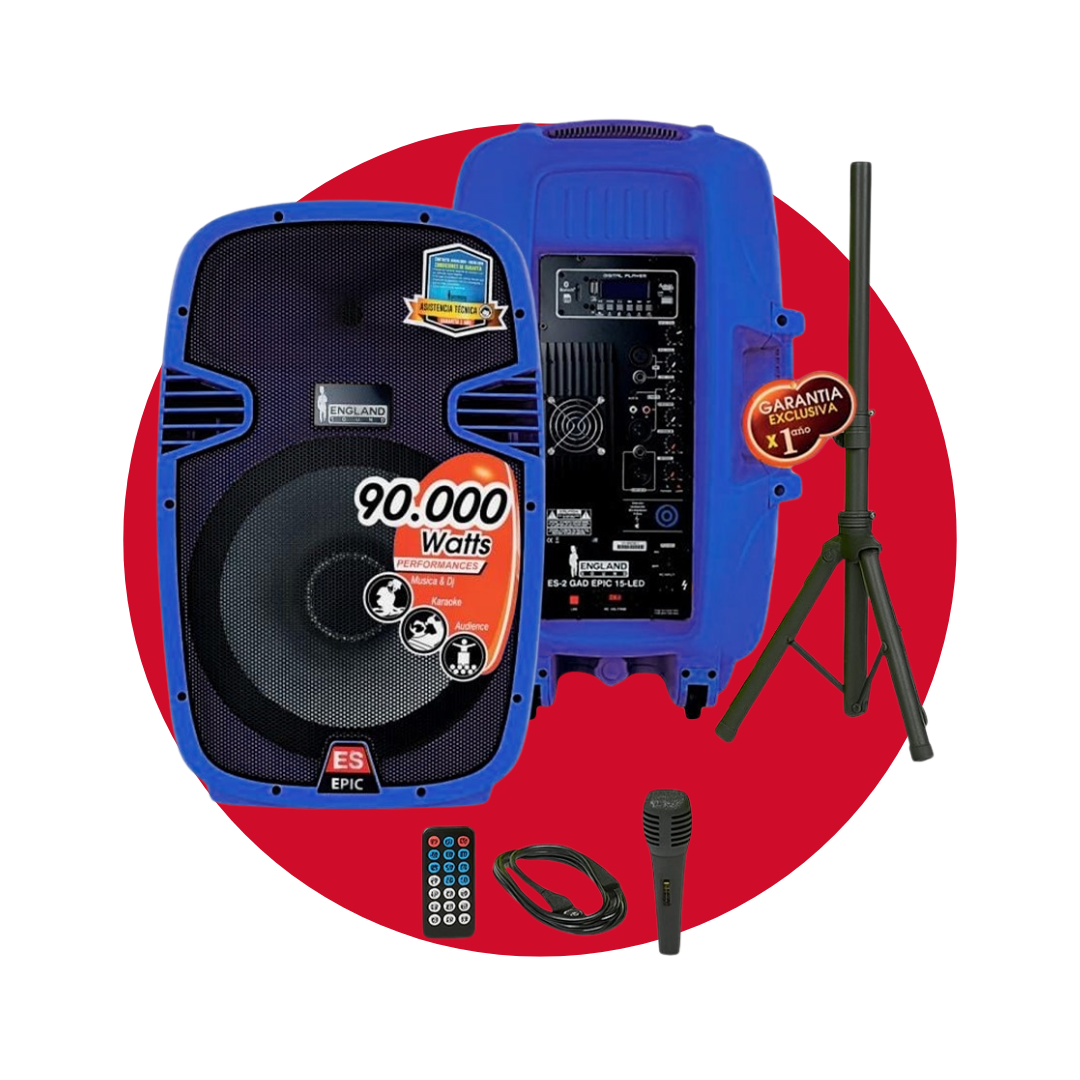La Caja Amplificada England Sound 15″ ES-2GADEPIC-BL es un potente sistema de audio de Clase AB y 150W RMS, diseñado con Iluminación RGB y conectividad Bluetooth, ideal para eventos.