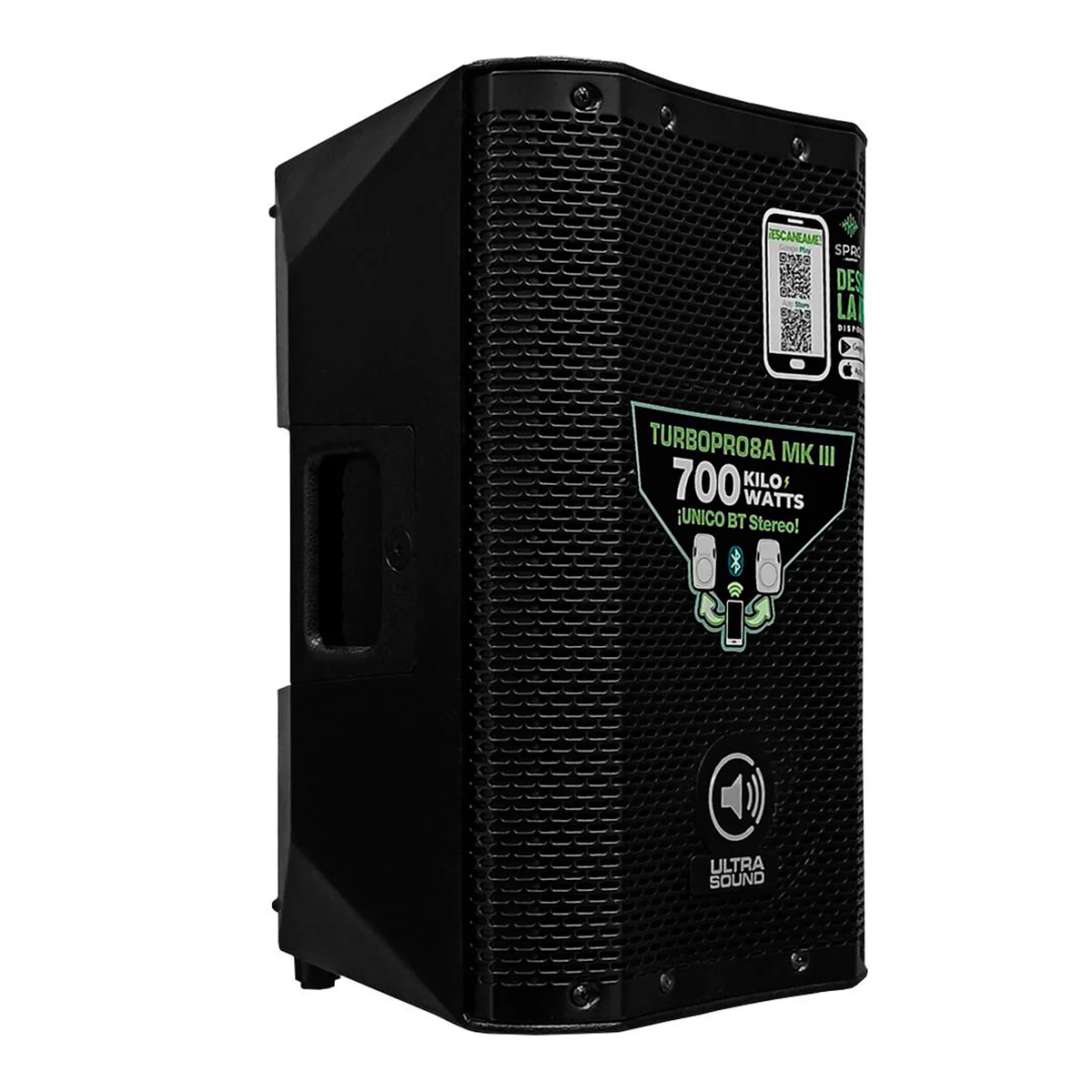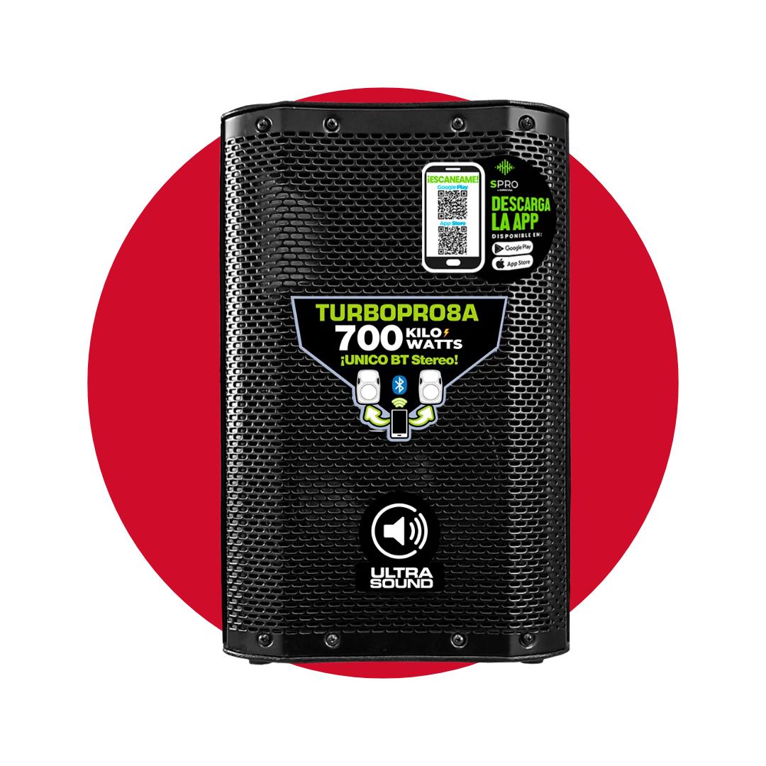 La Caja Amplificada Ultra Sound TURBOPRO8A MK3 es un altavoz activo de 8 pulgadas con una potencia máxima de 700 kilovatios. Se destaca por su tecnología BT STÉREO patentada y su control mediante APP móvil, ofreciendo conectividad moderna y múltiples opciones de entrada y salida para uso profesional.