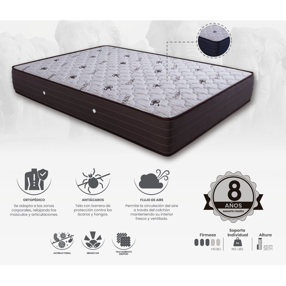 Colchón ideal con más de 45 años en el mercado, sinónimo de confianza y calidad. Su larga trayectoria respalda su fiabilidad y la satisfacción de quienes descansan en el. Con nuestra exclusiva tela acolchada de lujo conmemorativa, «Paraíso Aniversario 50».