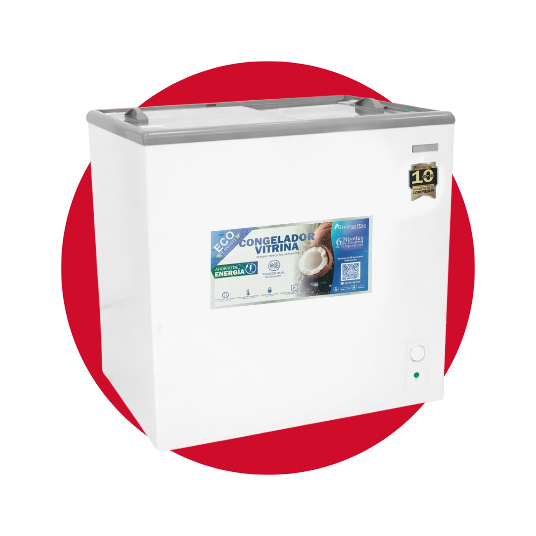 El CONGELADOR AMERICAN STAR de 167 Litros es un equipo dual con puerta de vidrio deslizante, diseñado tanto para el uso comercial como doméstico. Su diseño permite una visibilidad clara del inventario, mientras que su sistema con refrigerante ecológico R600A y su cerradura con llave garantizan una operación segura, eficiente y profesional.