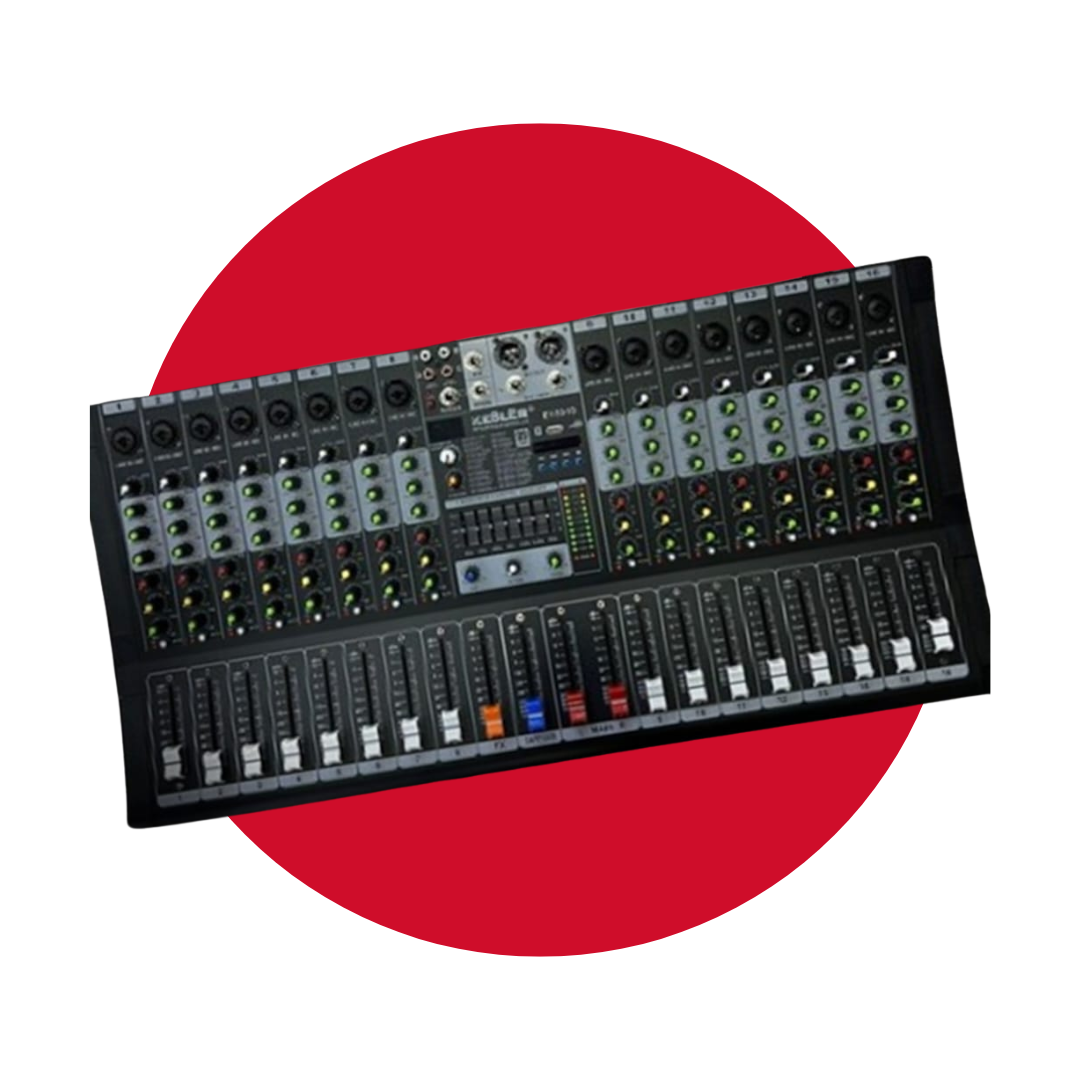 La Consola Kebler E15019 es una mesa de mezclas profesional de 16 canales mono, diseñada para sonido en vivo, grabaciones en estudio o aplicaciones de DJ. Cuenta con ecualizador de 3 bandas por canal, ecualizador gráfico estéreo de 7 bandas, 99 efectos digitales y alimentación fantasma +48V para micrófonos de condensador. Integra reproductor MP3 con Bluetooth, función de grabación y fuente de alimentación conmutada (100-240V), ofreciendo un control completo y versatilidad para eventos medianos y configuraciones fijas.