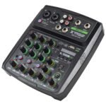 Mini consola multifunción de 4 canales con interfaz para PC y salida para dispositivos móviles, diseñada para grabaciones, streaming y transmisiones en vivo con efectos digitales y conectividad Bluetooth.