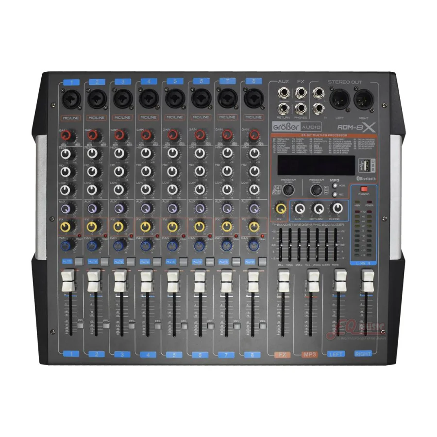 Consola pasiva profesional de 8 canales mono con ecualización de 3 bandas independiente, módulo DSP de 99 efectos, reproductor MP3 con grabación y ecualizador gráfico integrado de 7 bandas.