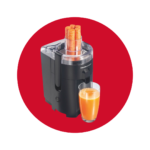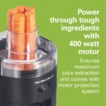 Crea jugos nutritivos y sabrosos rápidamente en la comodidad de tu cocina. El botón de encendido/apagado es fácil de usar y la práctica boquilla vierte el jugo fresco directamente en tu vaso, taza o jarra.