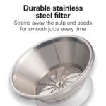 Al exprimir, el resistente filtro de acero inoxidable filtra la pulpa y las semillas para obtener resultados suaves. Al terminar de exprimir, todas las piezas extraíbles se pueden lavar en el lavavajillas para una limpieza fácil. Libre de BPA en las zonas de cocción. Con una garantía limitada de 3 años de Hamilton Beach, la marca número 1 en extractores de jugo.*