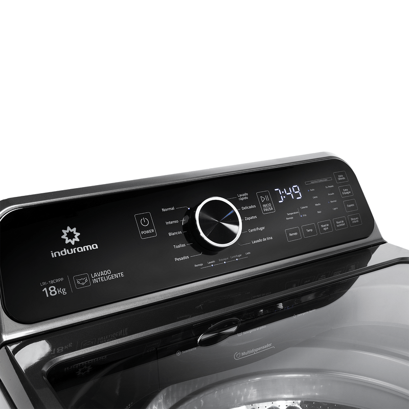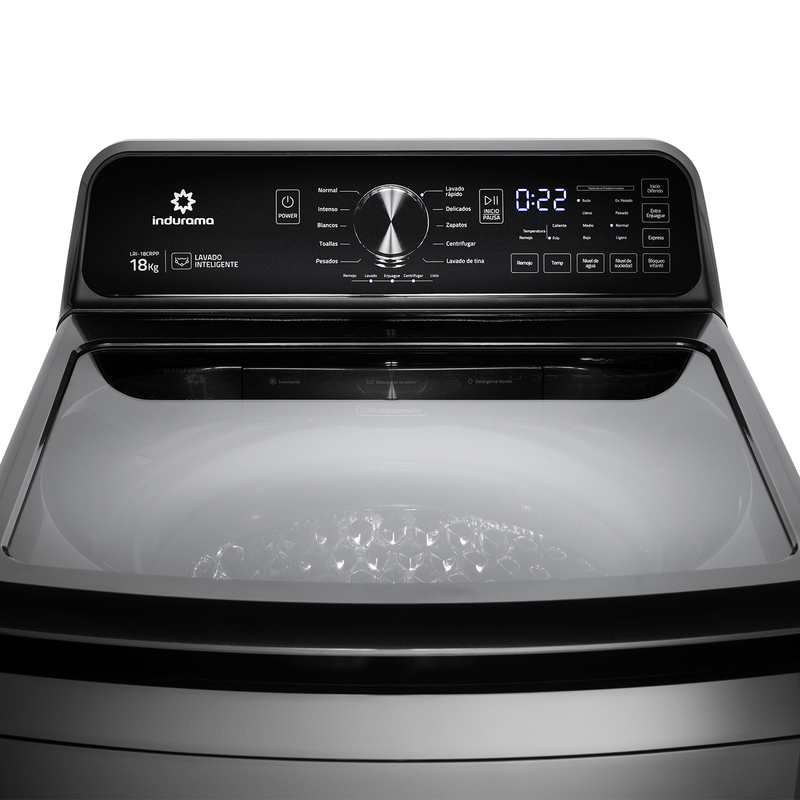 Lavadora automática Indurama LRI-18CRPP de 18 kg con acabado Titanium. Cuenta con tambor de acero inoxidable, 10 programas de lavado, incluyendo ‘Zapatos’, y funciones avanzadas como ‘Inicio Diferido’ y ‘Lavado Inteligente’.