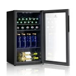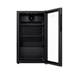 Minibar Indurama VFV-120, con una capacidad de 94 litros, diseñado para uso comercial o doméstico. Cuenta con un sistema NoFrost, refrigerante ecológico R600, y un rango de temperatura ajustable de 2°C a 12°C. Su puerta de vidrio es resistente a rayos UV de baja emisividad, y el interior está iluminado con LED, con parrillas de vidrio y un control de temperatura digital. Con un diseño moderno en negro mate, sus dimensiones compactas (83.5 cm de alto x 47.5 cm de ancho x 44.8 cm de profundidad) lo hacen ideal para espacios reducidos.
