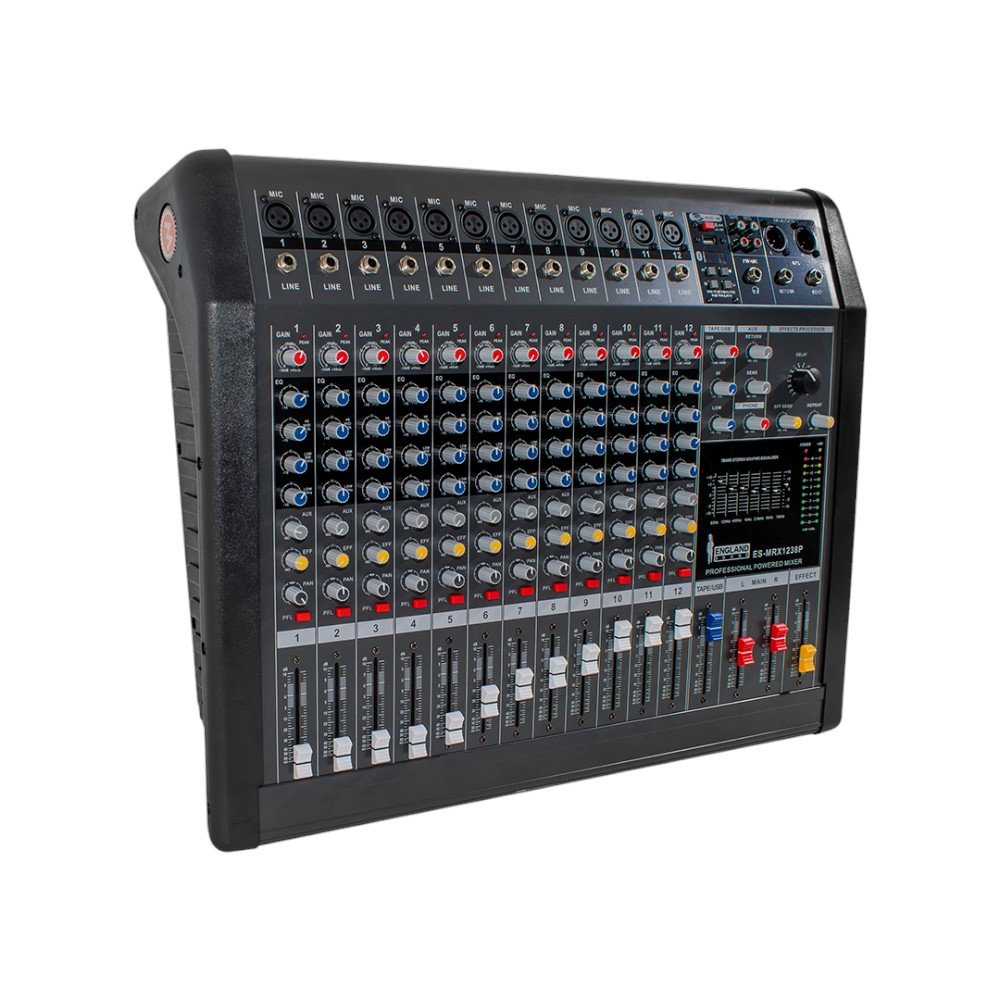 El Mixer Profesional 12 canales 382W ENGLAND SOUND ES-MRX1238P es una consola amplificada de alto rendimiento diseñada para ofrecer máxima versatilidad y calidad en todo tipo de eventos. Con una potente salida de 760W (2x380W), este equipo proporciona un sonido limpio y potente que se adapta a cualquier situación, desde conciertos hasta conferencias. Con 12 canales de mezcla, ofrece múltiples opciones para conectar micrófonos y dispositivos de audio.