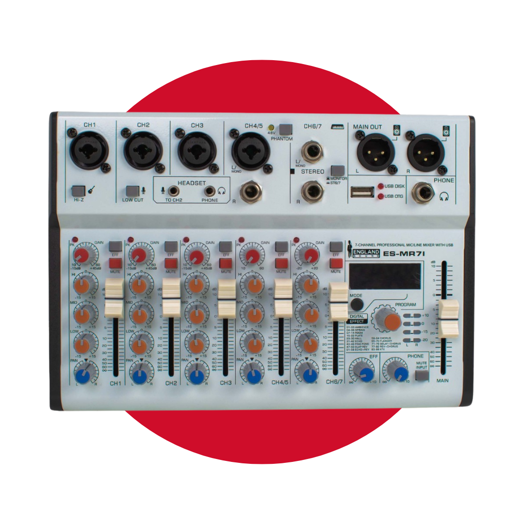 La Mixer Profesional 7 canales ENGLAND SOUND ES-MR7I es una herramienta esencial para músicos y productores. Diseñada para ofrecer una mezcla de alta calidad, esta consola pasiva incorpora múltiples características que facilitan la conexión y el control de audio en vivo.