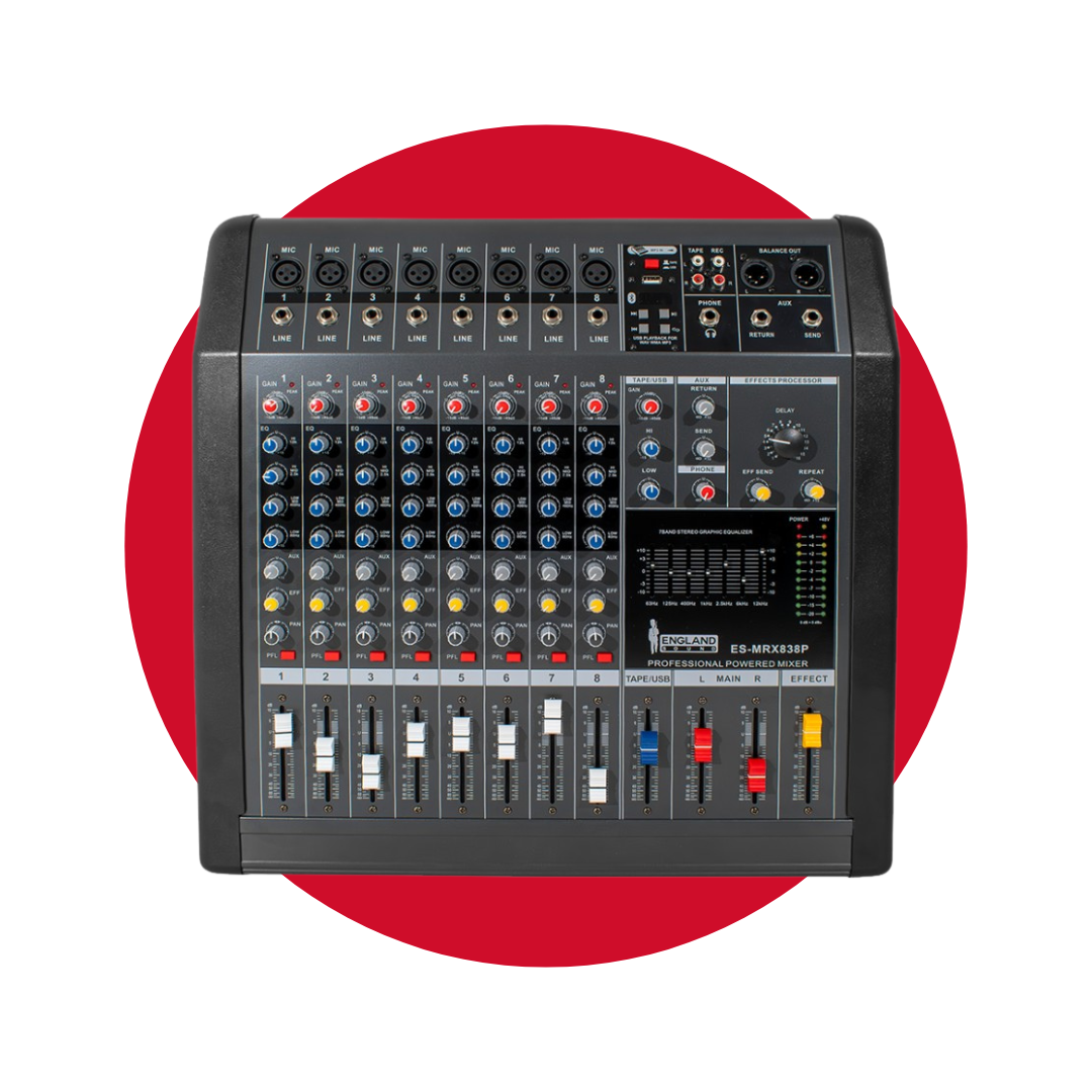 El Mixer Profesional 8 canales 382W ENGLAND SOUND ES-MRX838P es la solución ideal para músicos, DJs y productores que requieren calidad y potencia en sus presentaciones. Con una capacidad de hasta 760W, este mezclador amplificado destaca por sus 8 canales (8 mono + 1 estéreo) que permiten una flexibilidad total al momento de mezclar audio. Su diseño robusto y eficiente garantiza un rendimiento óptimo en cualquier escenario.