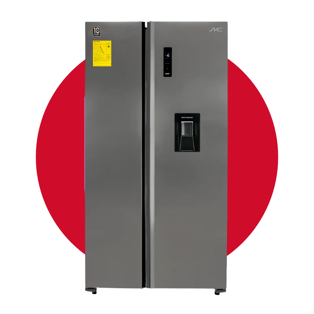 La NEVERA SMC SIDE BY SIDE 513 LITROS en color Silver es un refrigerador No Frost de alta capacidad (513 L) con dispensador de agua integrado en la puerta y control de temperatura mediante pantalla LED.