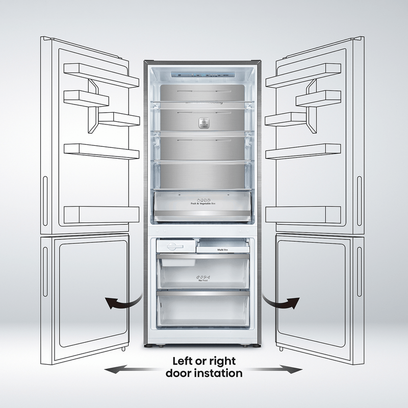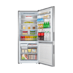 Refrigeradora Bottom Mount de 404 litros con diseño PureFlat en croma, tecnología Total No Frost y filtro de carbón activado, optimizando la conservación y el estilo en cocinas modernas.