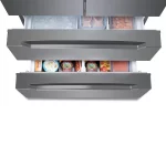 Refrigeradora French Door Croma de 671 litros con diseño moderno en acabado croma y lámina antihuellas. Equipada con compresor Inverter, refrigerante R600, panel digital de temperatura y funciones avanzadas como Super Cooling y Super Freezing. Ideal para hogares que buscan eficiencia energética, organización avanzada y un diseño elegante.