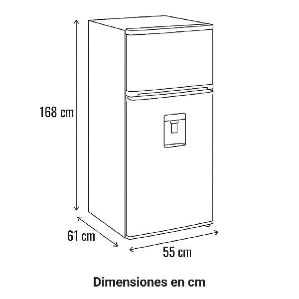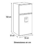 Refrigeradora No Frost de 247 litros con eficiencia energética clase A, dispensador de agua integrado y diseño en lámina acerada, ideal para espacios modernos y funcionales.
