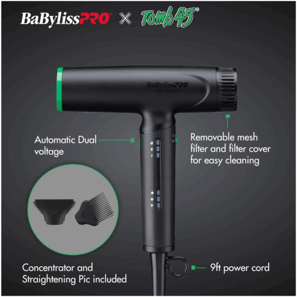 El Secador BaBylissPRO Digital Compacto 1400 W BNTC9200T45UX (serie Tomb 45) es una herramienta de secado profesional, liviana y potente, diseñada para ofrecer resultados suaves, brillantes y rápidos. Está equipado con tecnología avanzada, un diseño ergonómico y múltiples funciones que mejoran la experiencia de uso tanto en entornos profesionales como personales.