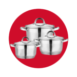 Magnifico Juego de Ollas de Acero Inoxidable de la prestigiosa marca MTX, con fondo encapsulado de 5 capas, tapas de vidrio resistente a golpes, mangos y asas de acero inoxidable.
