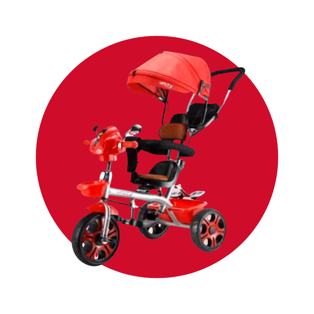 -Canastilla trasera -Pedal reforzado -Toldo -Guiador COLORES: ROJO – AZUL – ROSADO