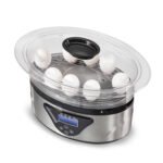 Obtén huevos cocidos colocando el fondo del recipiente para vapor superior o inferior con el soporte del huevo hacia arriba. Coloca hasta 8 huevos grandes en posición vertical en el soporte, luego llena el depósito de agua hasta la línea MAX. Coloca la bandeja de goteo en la parte superior del depósito de agua, agrega el tazón para vapor y coloca la tapa de forma segura en la parte superior. Luego, solo configura el tiempo de cocción de acuerdo con el tipo de huevos que deseas para obtener huevos perfectos cada vez.