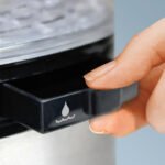 Esta vaporera se apagará automáticamente si el agua se agota. Se apagará, emitirá un pitido, la pantalla parpadeará ‘- -‘ y la luz de BAJA AGUA se iluminará. Para agregar agua no es necesario desmontar la vaporera; simplemente saca el cajón de agua y llénalo gradualmente con agua. Verifica la ventana de visualización para ver el nivel del agua y reinicia el vaporizador.